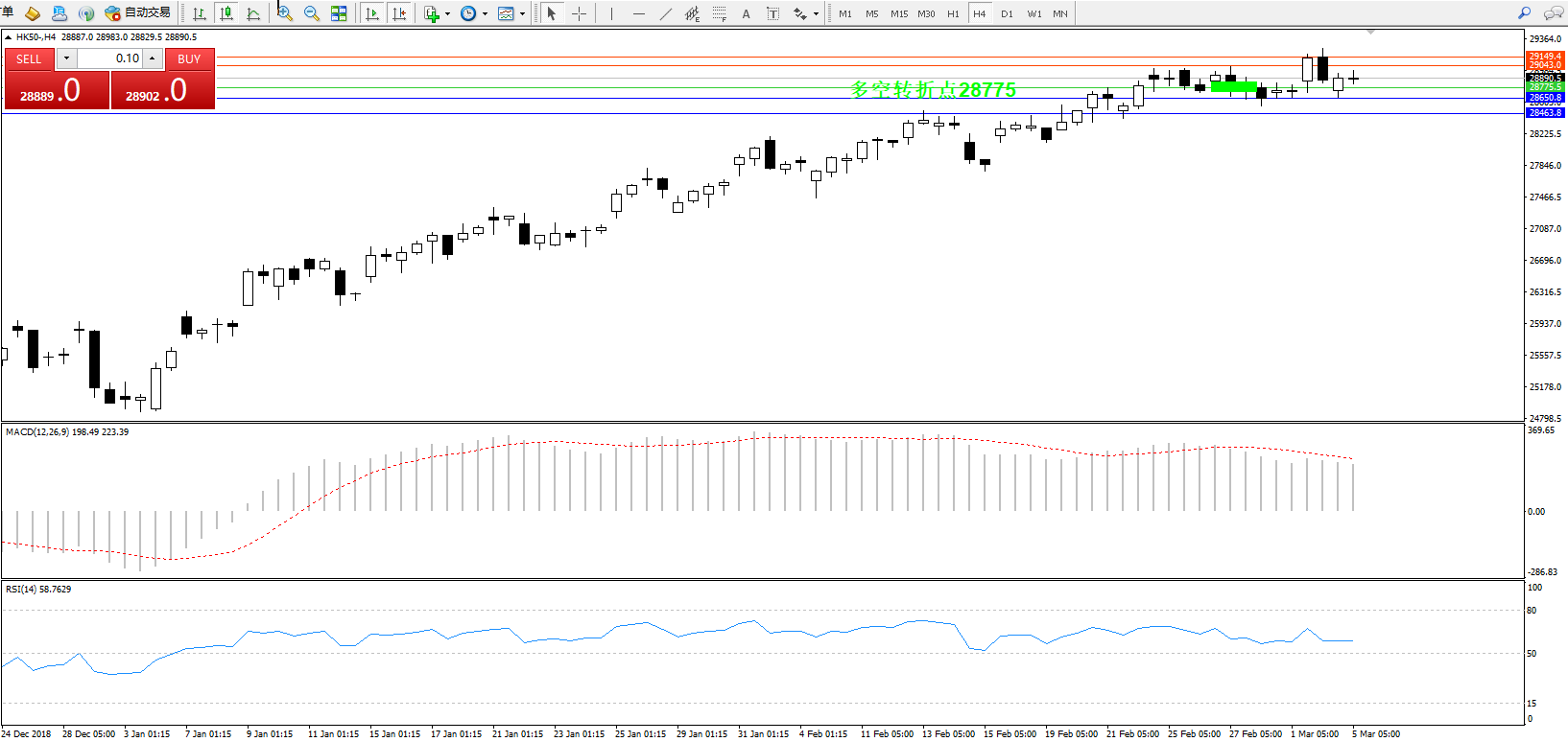 恒指HK50 ——4小时K线图显示: