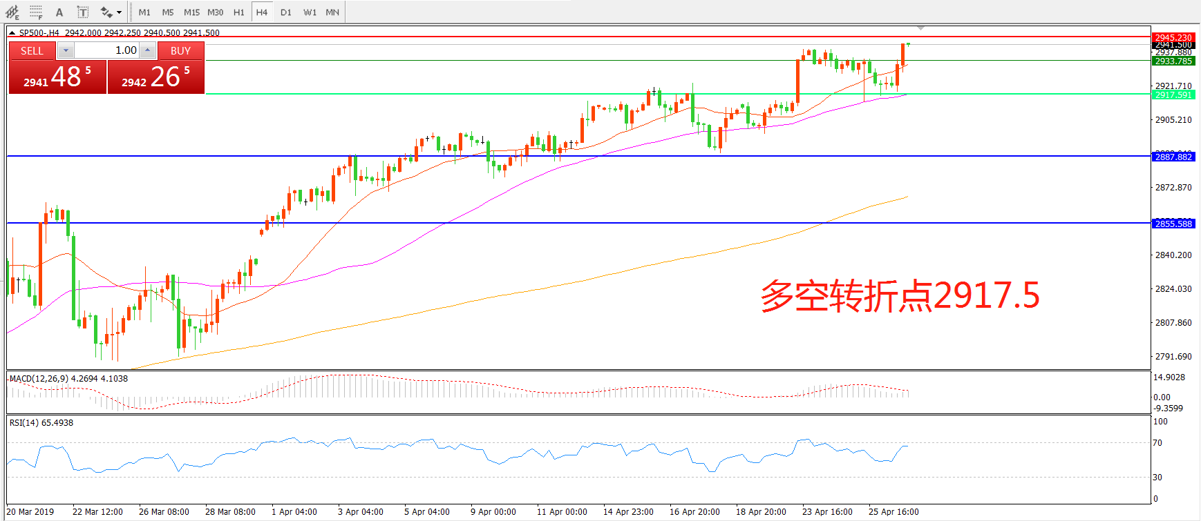 4小时图看,标普500回踩55均线后继续上行, 整体走势十分强势,均线系统呈多头排列,但MACD红柱缩短,RSI指标向下,日内预计仍以多头思路为主。