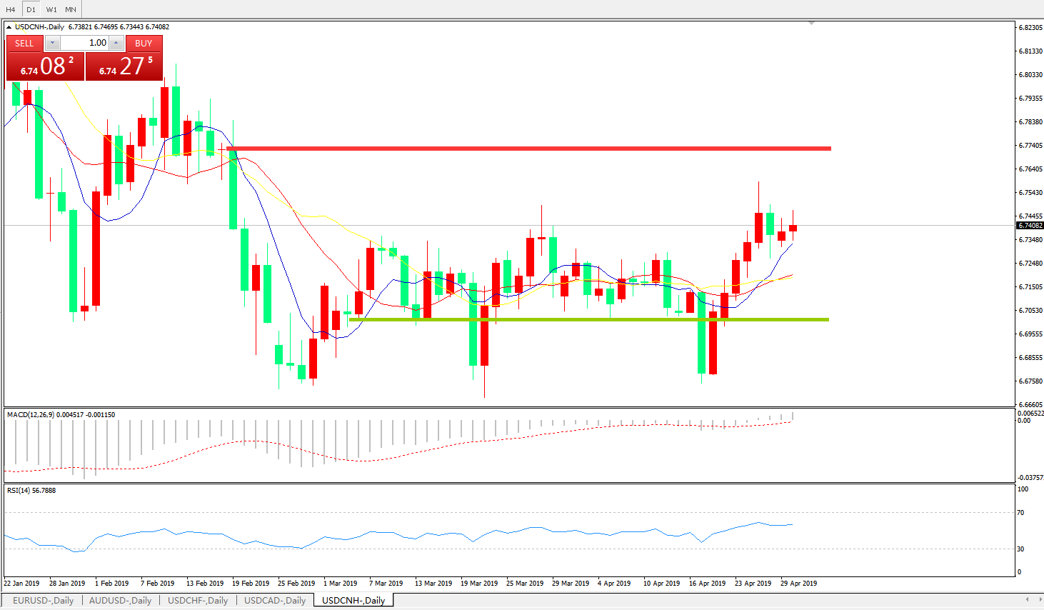 交易策略6.6990之上,看涨,目标价位为6.7845,然后为6.8185