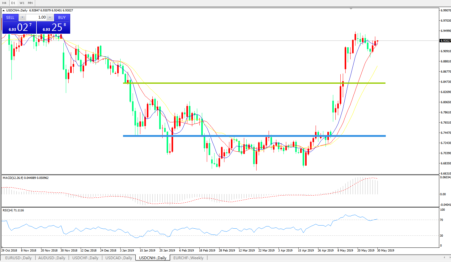 技术面简析:日线图均线整体维持攻势,MACD在0轴上方运行但动能柱轻微缩量,RSI超买区域附近运行,汇价强力上攻后宽幅强势整理,预计短期汇价有下行回踩需求,中期重点关注中美贸易争端后续进展。