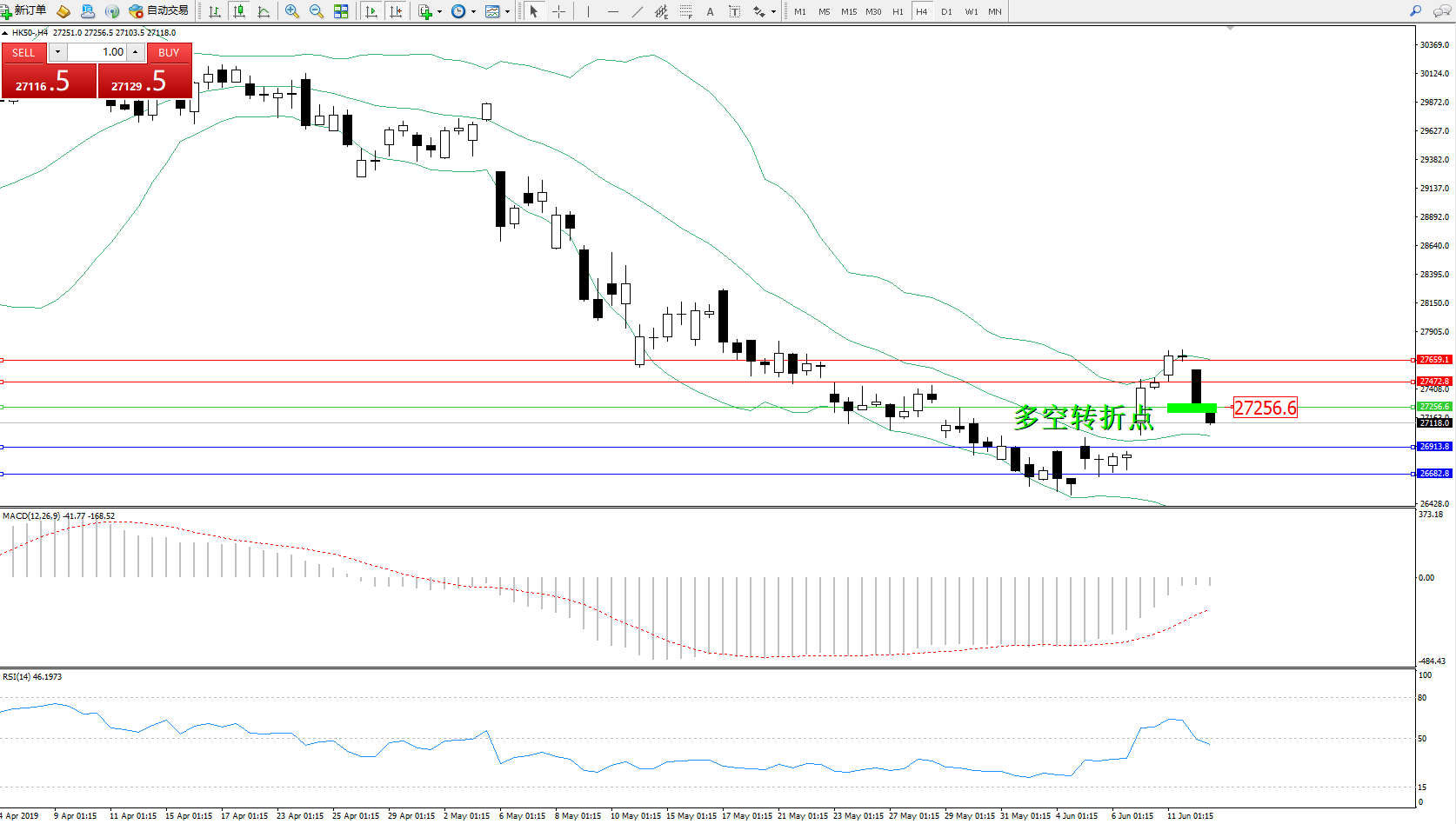 恒指HK50 ——4小时K线图显示:
