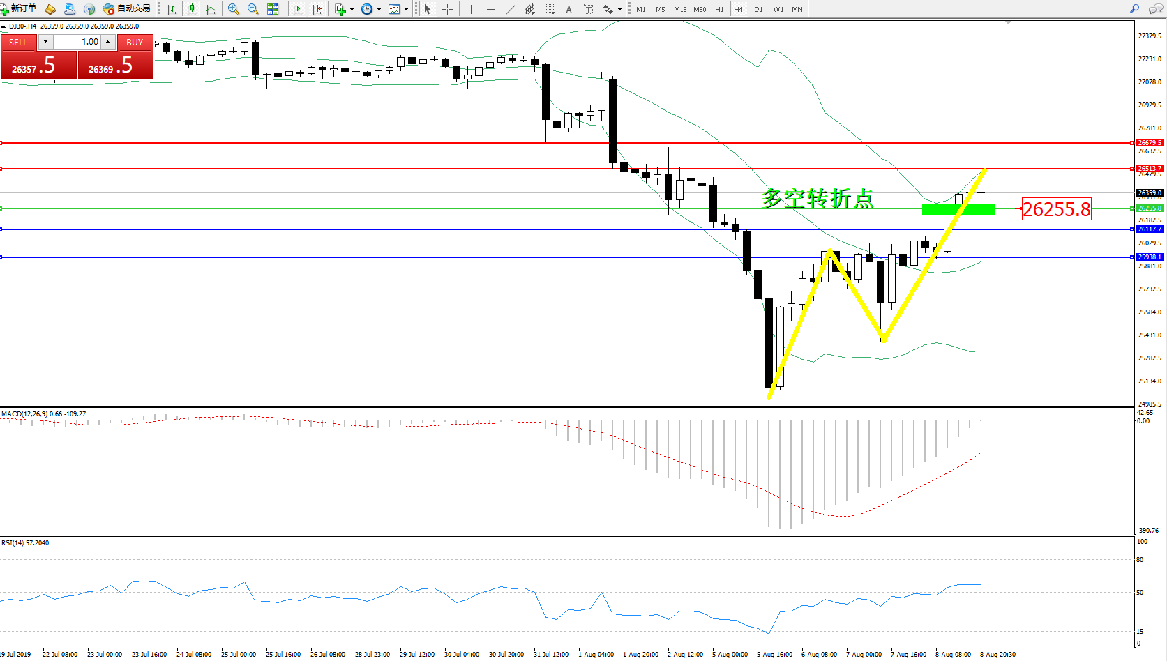 道琼斯指数DJ30—— 4小时K线图显示: