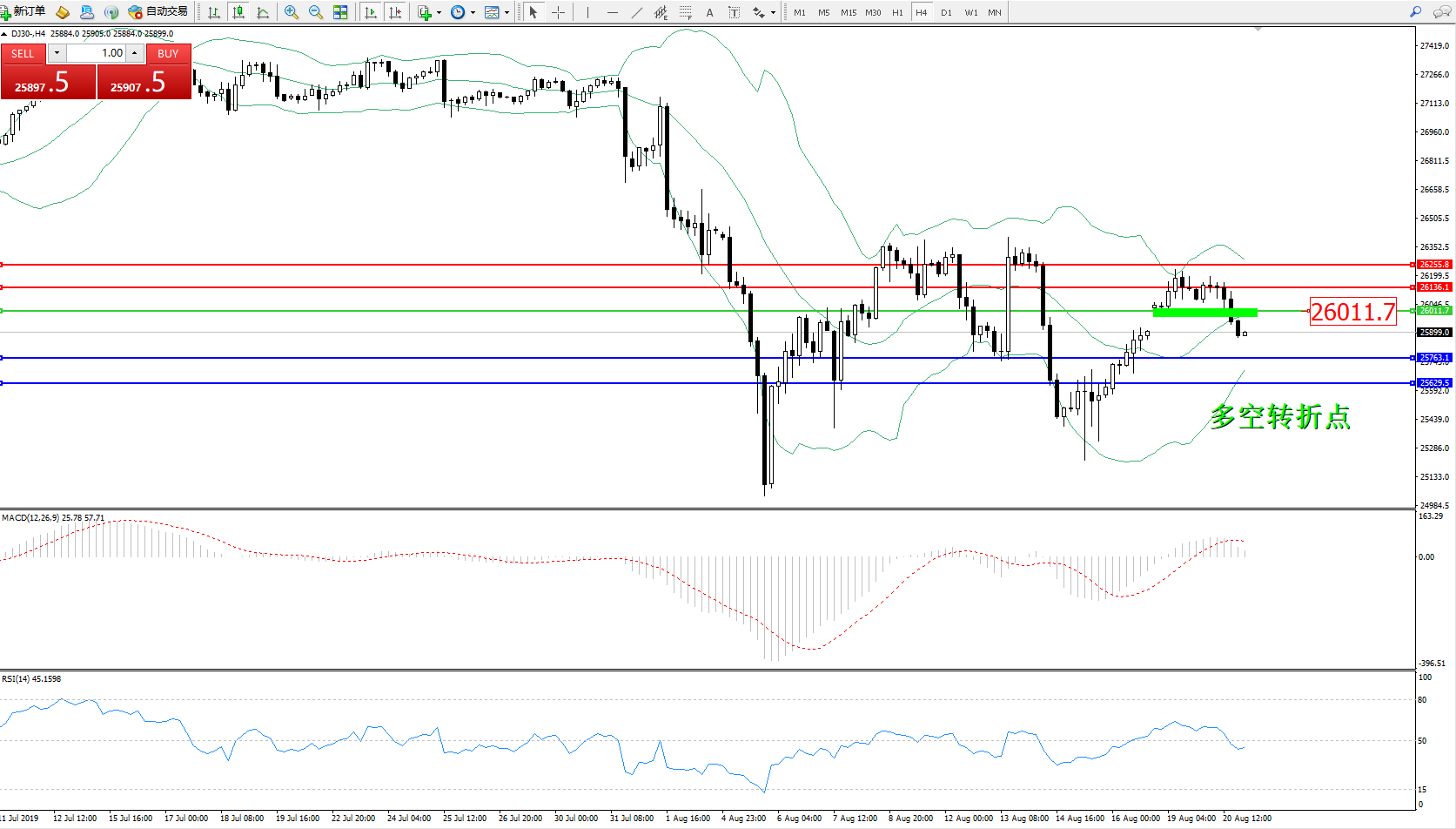 道琼斯指数DJ30—— 4小时K线图显示:
