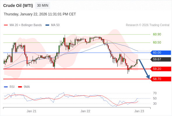 交易策略: 在 60.00 之下,看跌,目标价位为 59.20 ,然后为 58.70 。