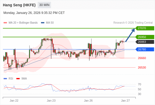 在 26780 之上,看涨,目标价位为 26950 ,然后为 27070 。