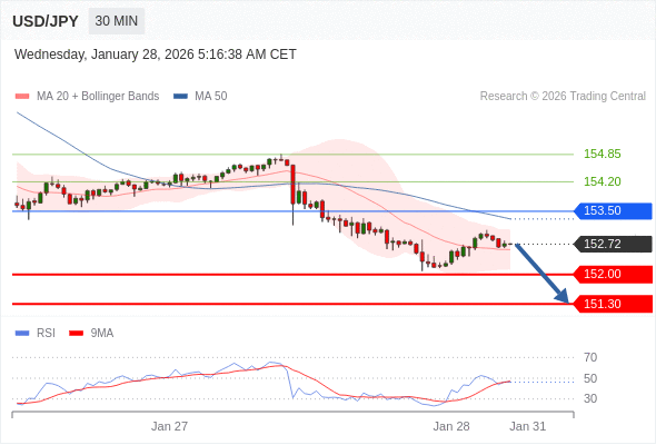 在 153.50 之下,看跌,目标价位为 152.00 ,然后为 151.30 。