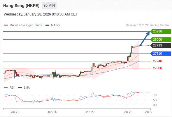在 27510 之上,看涨,目标价位为 28000 ,然后为 28280 。