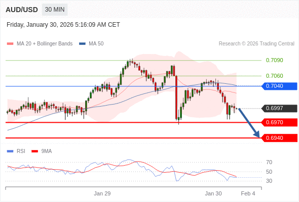 在 0.7040 之下,看跌,目标价位为 0.6970 ,然后为 0.6940 。