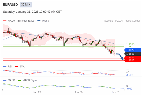 欧元/美元 当日内 : 看跌,在 1.1879 之下。