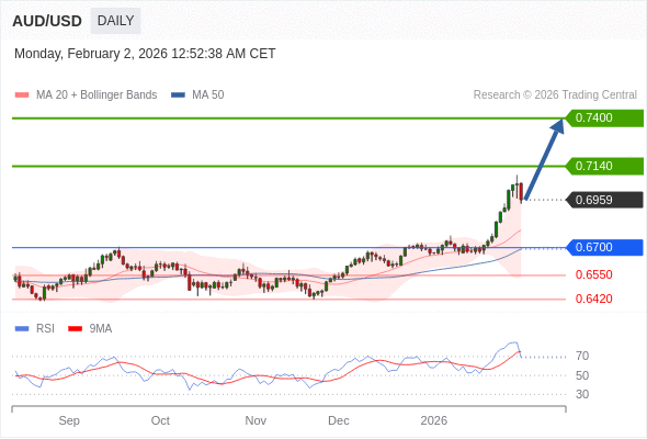 在 0.6700 之上,看涨,目标价位为 0.7140 ,然后为 0.7400 。