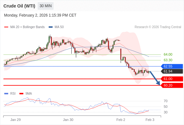 交易策略: 在 62.55 之下,看跌,目标价位为 61.00 ,然后为 60.20 。