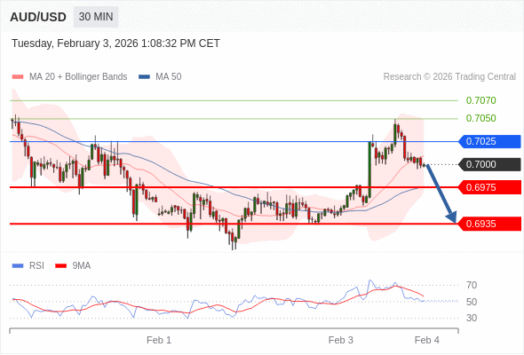在 0.7025 之下,看跌,目标价位为 0.6975 ,然后为 0.6935 。