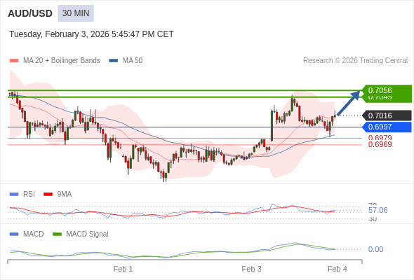 澳元/美元 当日内 : 看涨,当 0.6997 为支撑位,目标定在0.7056。