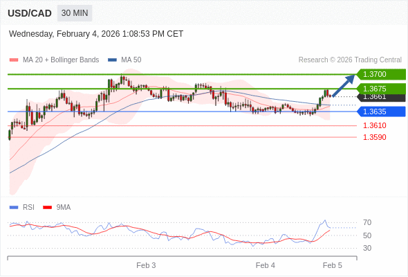 在 1.3635 之上,看涨,目标价位为 1.3675 ,然后为 1.3700 。