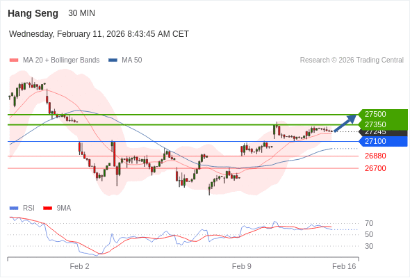 恒生指数 当日内: 超短线(当日内)支撑位在27100附近。