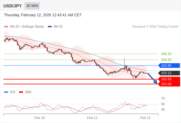 在 153.90 之下,看跌,目标价位为 152.50 ,然后为 152.00 。