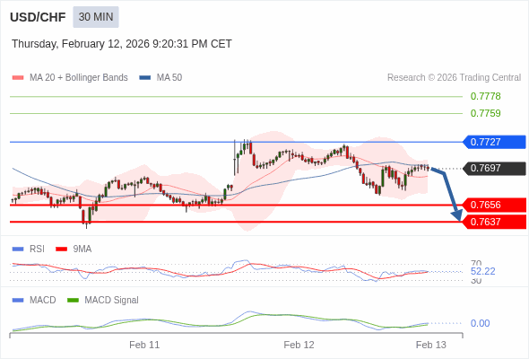 美元/瑞郎 当日内 : 在进一步下跌之前,反弹至 0.7727 附近。