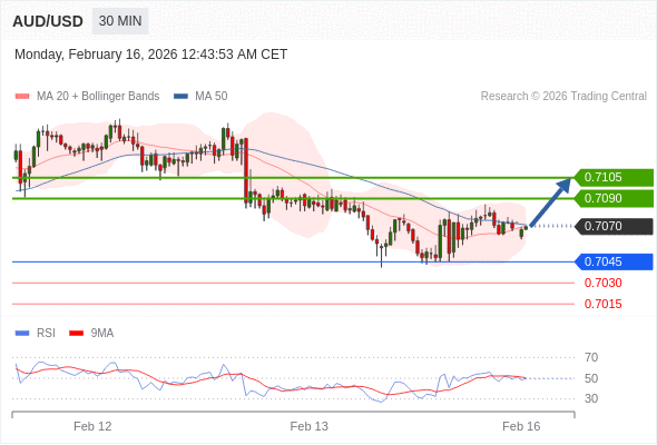 在 0.7045 之上,看涨,目标价位为 0.7090 ,然后为 0.7105 。