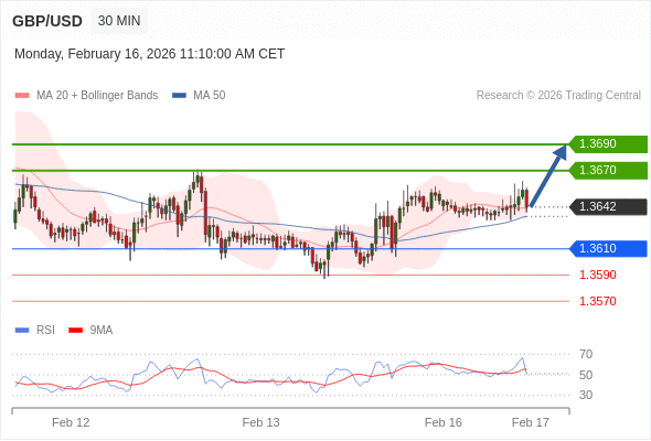 在 1.3610 之上,看涨,目标价位为 1.3670 ,然后为 1.3690 。