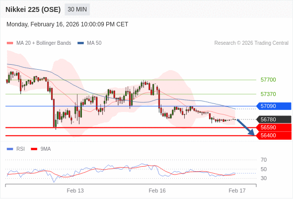 交易策略: 在 57090 之下,看跌,目标价位为 56590 ,然后为 56400 。