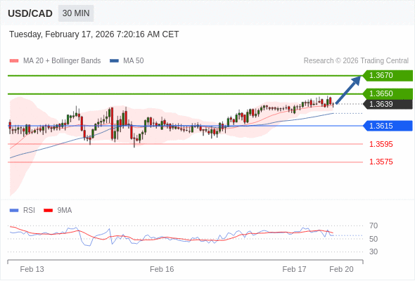 在 1.3615 之上,看涨,目标价位为 1.3650 ,然后为 1.3670 。