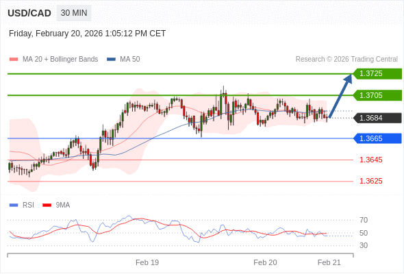 在 1.3665 之上,看涨,目标价位为 1.3705 ,然后为 1.3725 。