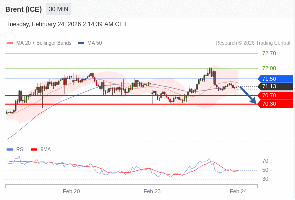 在 71.50 之下,看跌,目标价位为 70.70 ,然后为 70.30 。