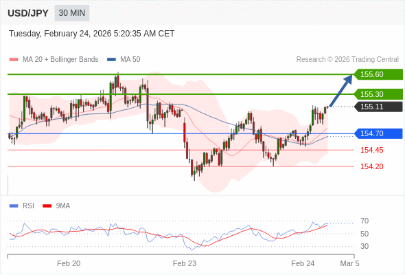在 154.70 之上,看涨,目标价位为 155.30 ,然后为 155.60 。