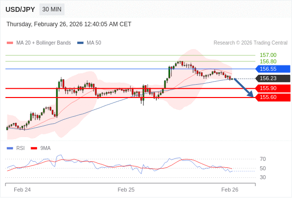在 156.55 之下,看跌,目标价位为 155.90 ,然后为 155.60 。