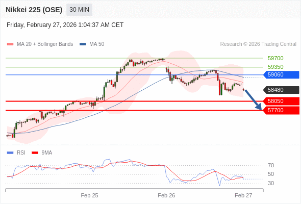 在 59060 之下,看跌,目标价位为 58050 ,然后为 57700 。