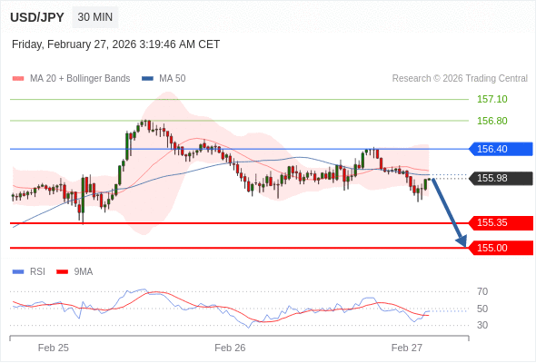 交易策略: 在 156.40 之下,看跌,目标价位为 155.35 ,然后为 155.00 。