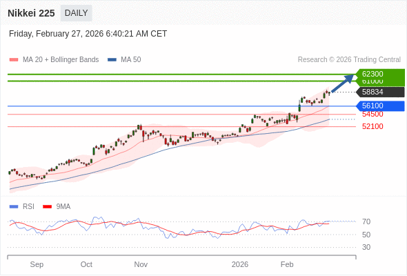 Nikkei 225 短线: 期待62300。