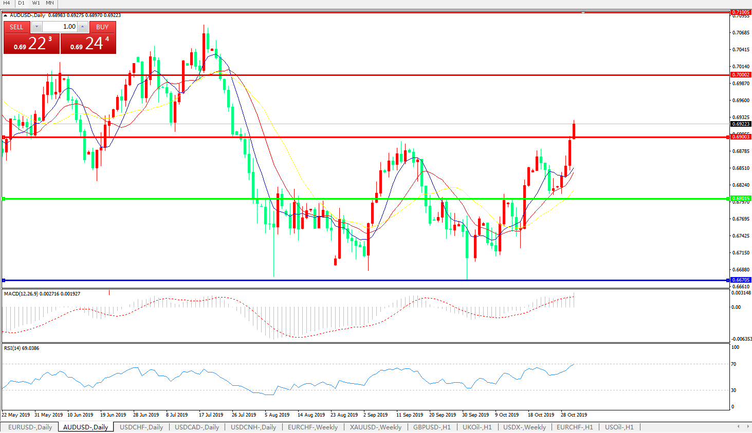 交易策略:0.6800上方看涨,目标0.6900、0.7000