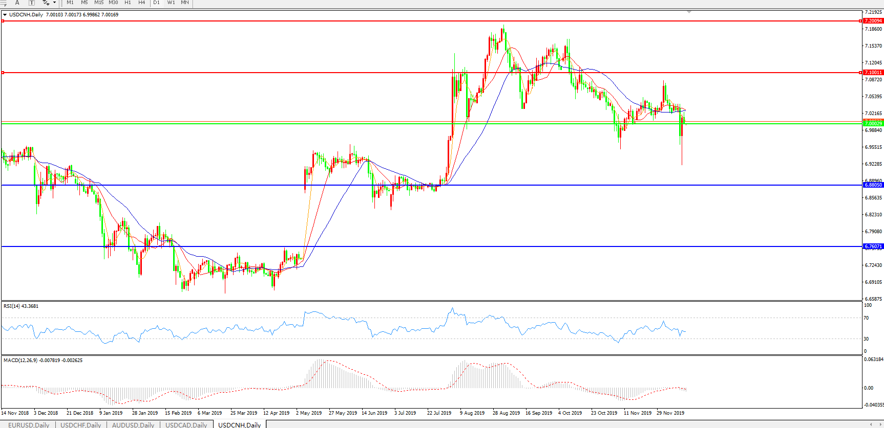 技术面简析:日图均线呈有序空头排列,汇价骤跌破7.0关口,MACD自0轴附近快速走低且量能0轴下方快速放量,RSI骤跌走低,预计短期汇价将在进一步下行。