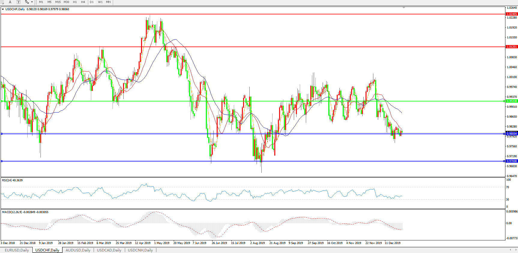 技术面简析:日线图均线呈有序空头排列,汇价弱势整理于0.98关口附近,MACD运行于0轴下方且量能0轴下有放量迹象,RSI窄幅震荡,预计汇价在反弹整理后将进一步下行。