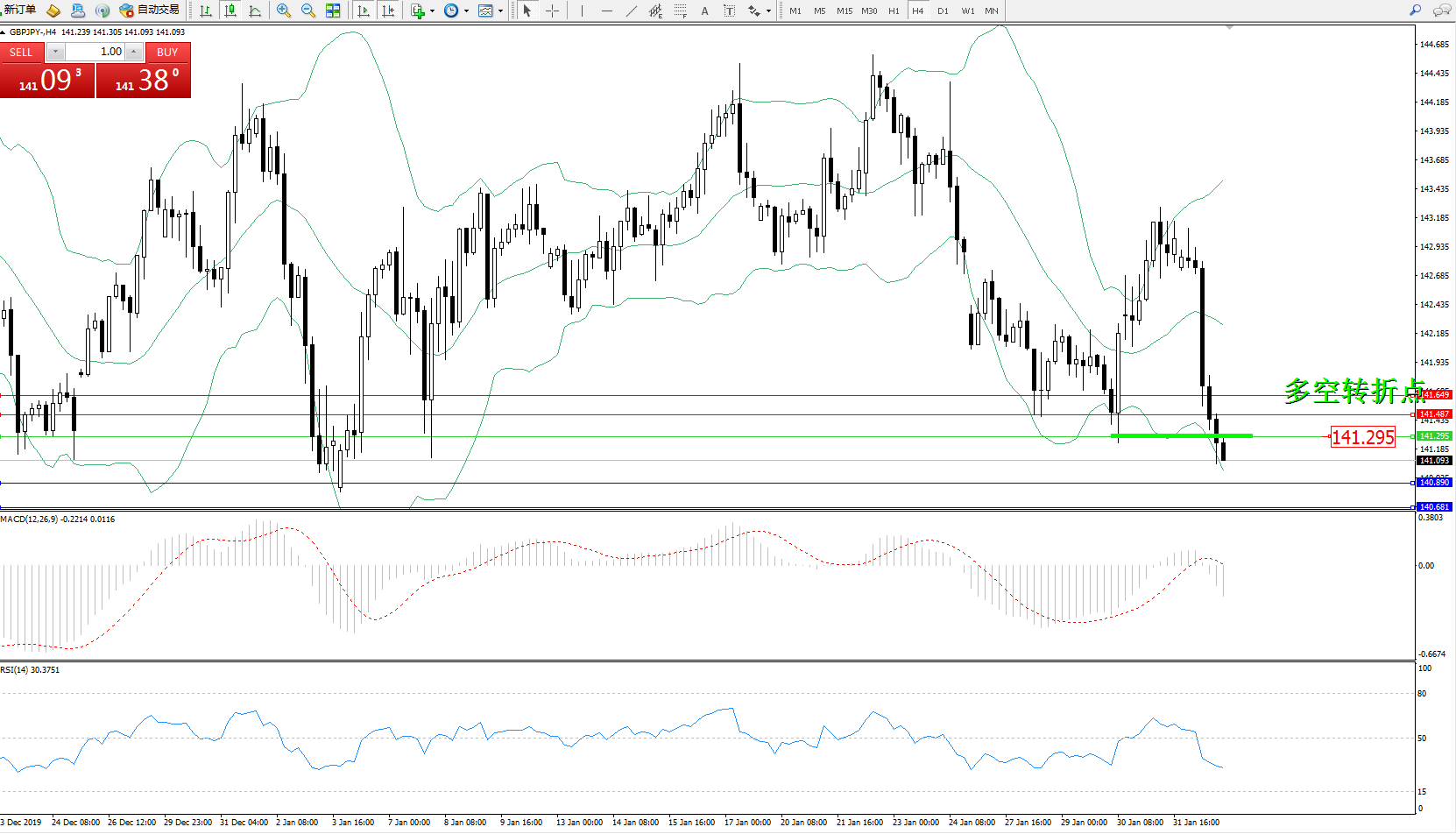 交易策略:141.295下方看跌,目标140.890140.681