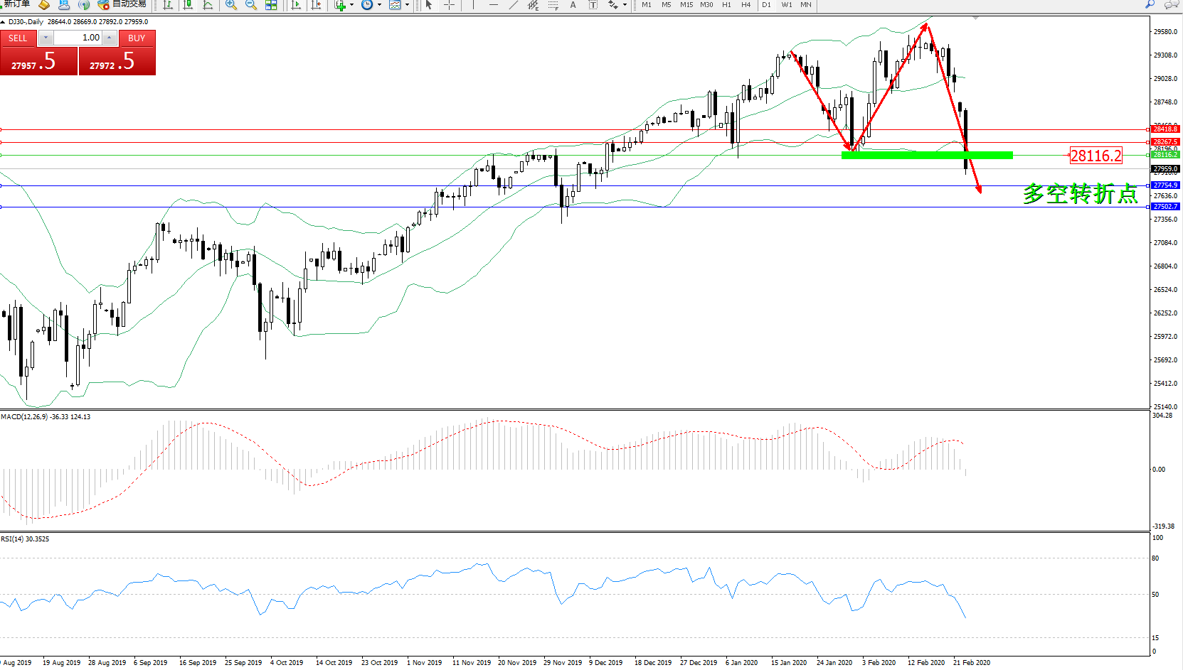交易策略:28116下方看跌,目标27754、27502