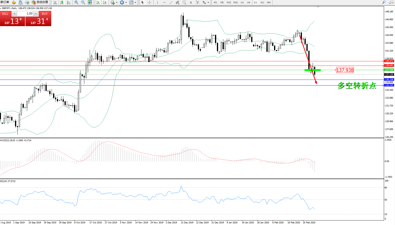 交易策略:137.938下方看跌,目标136.238、135.243