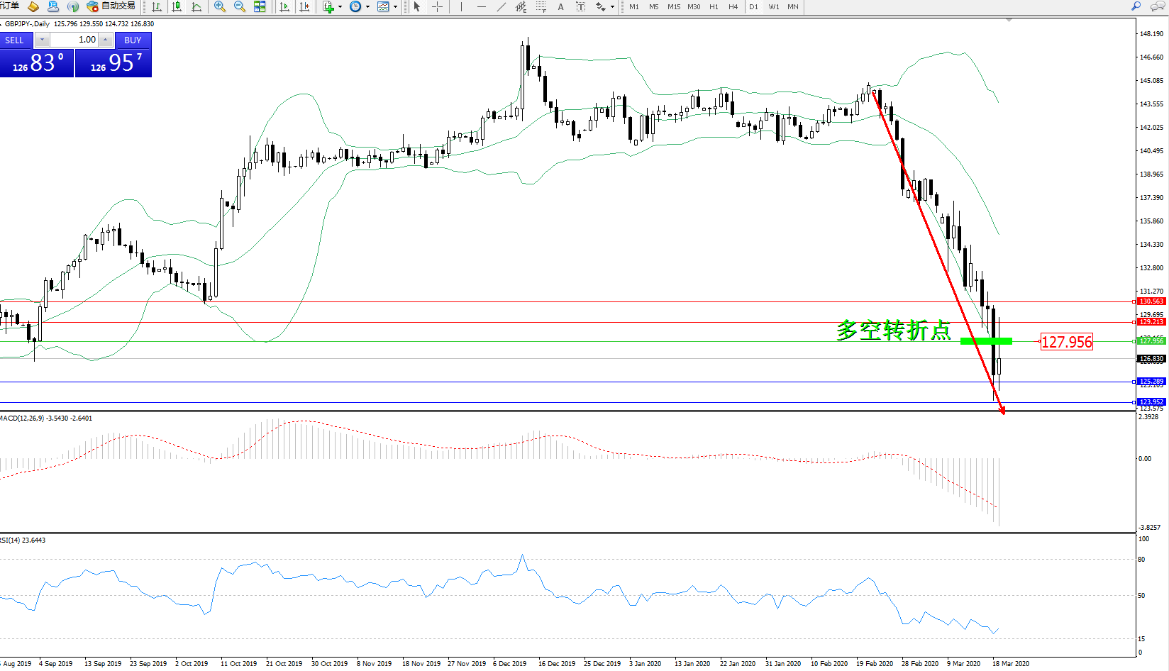 交易策略:127.956下方看跌,目标125.289123.952