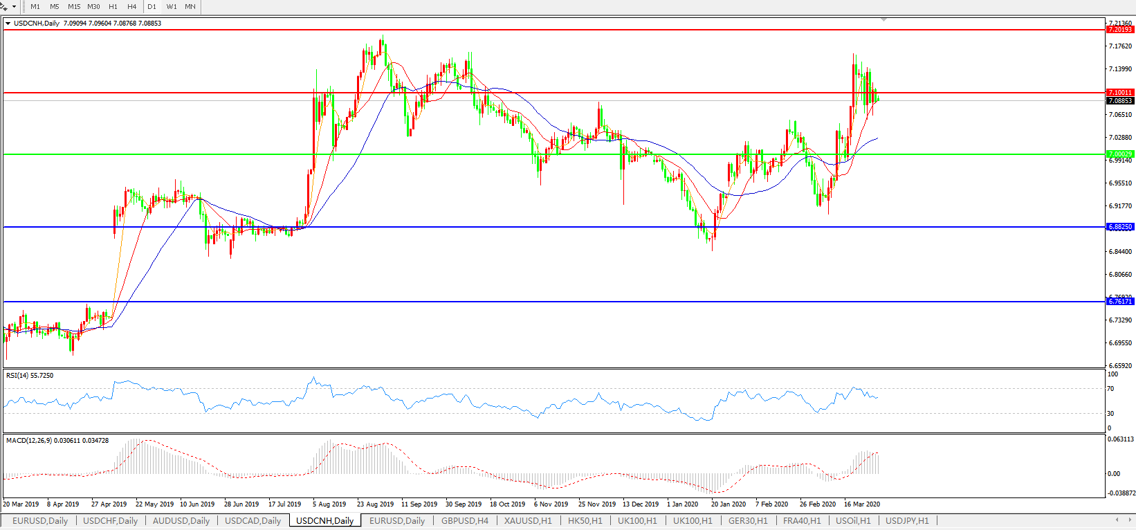 美元兑人民币USDCNH 日线图: