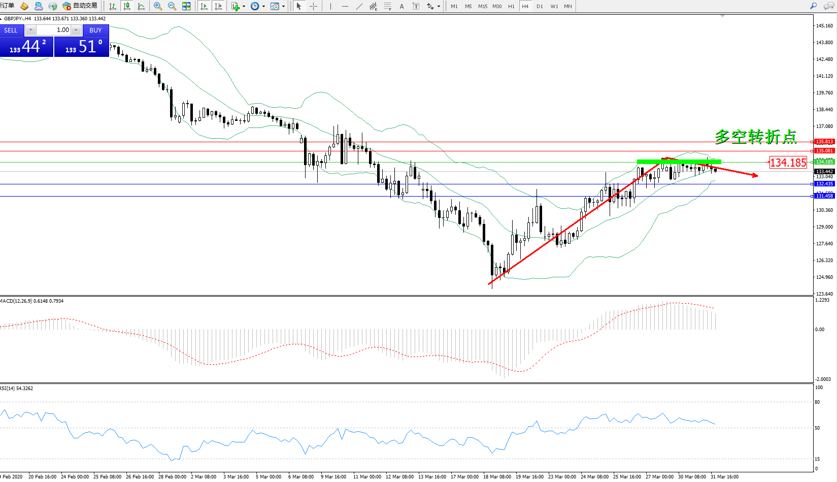 交易策略:134.185下方看跌,目标132.435131.458