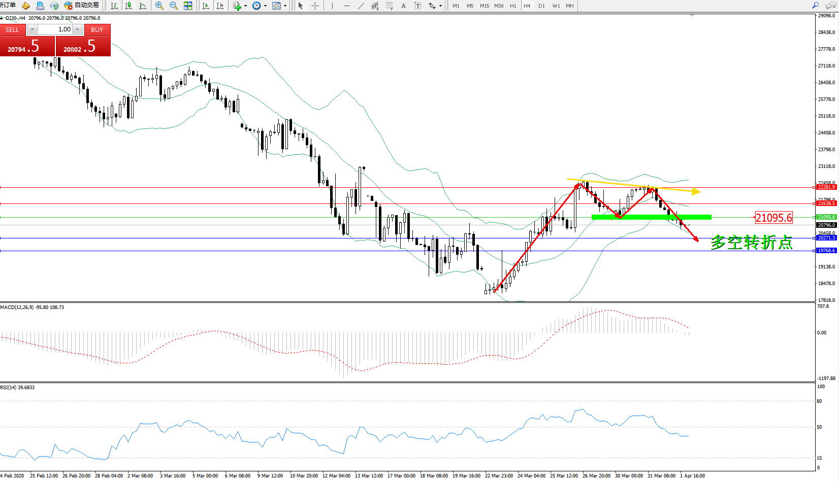 道琼斯指数DJ30—— 4小时K线图显示: