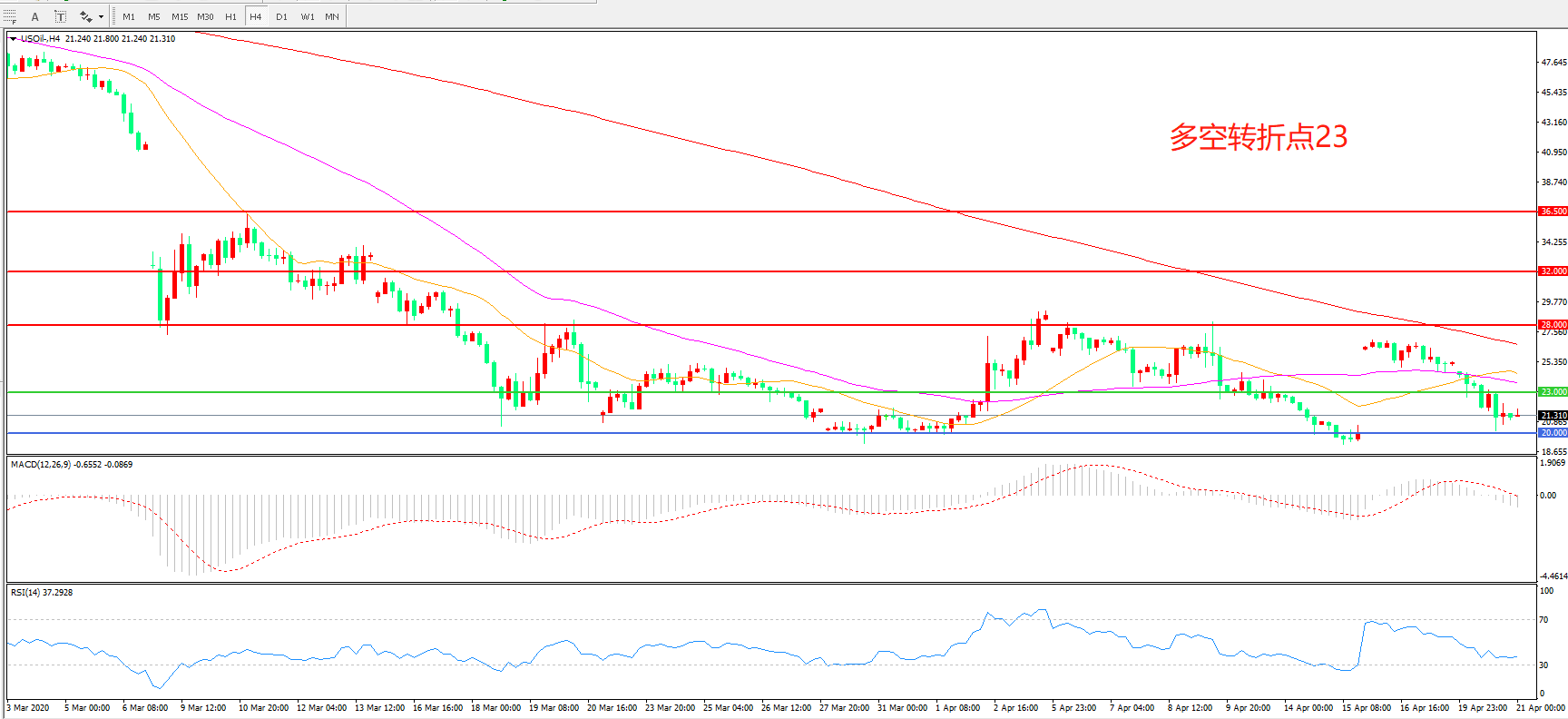 交易策略:在23.00之下看跌,目标20.00 18.00