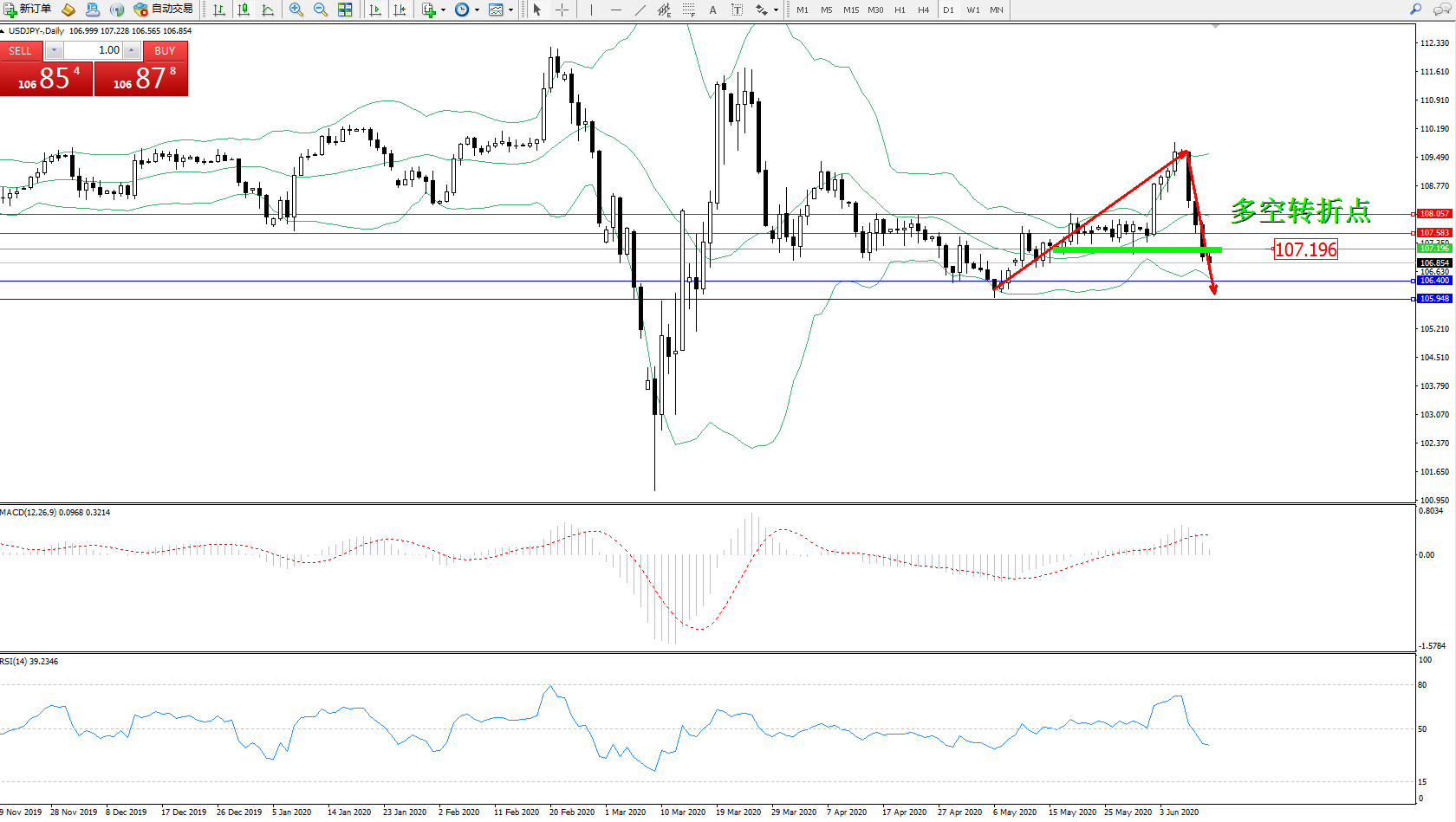 交易策略:107.196下方看跌,目标106.400、105.948