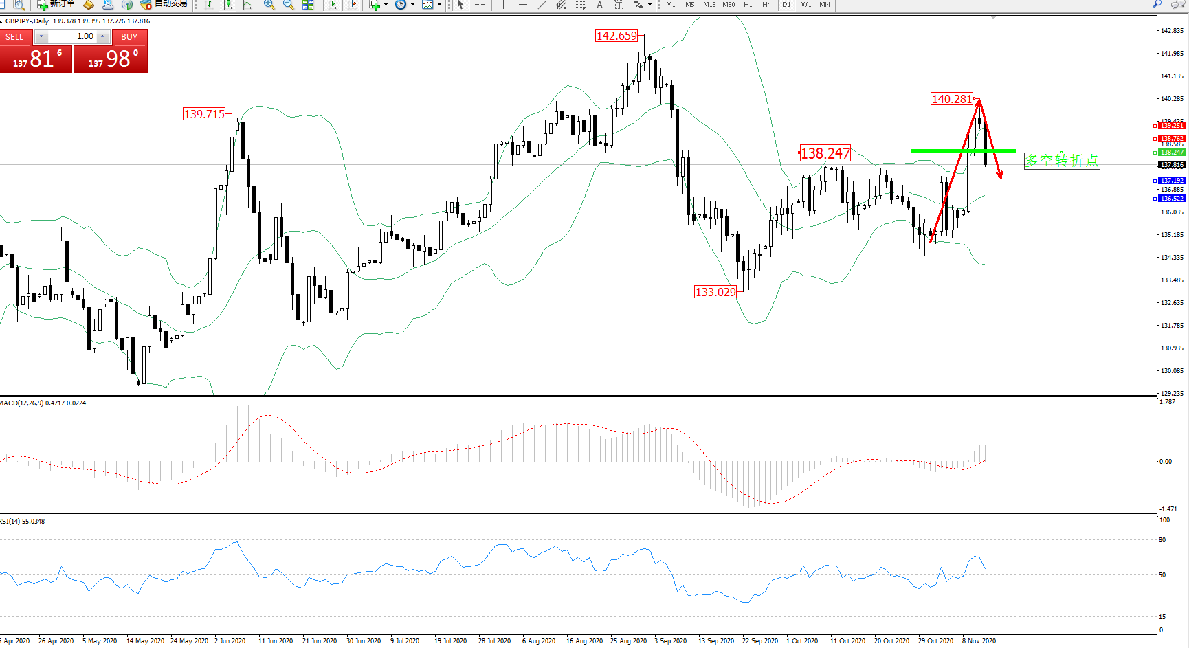 技术点评:多头动力延续布林带指标上轨附近强势拉升上扬态势良好,高位抵达140.281附近后遇阻开始快速回撤下移,多头拉升动力结束,空头下行动力入场,布林带指标呈张口走势后有收口迹象,MACD指标低位多头多空持续震荡上扬至0轴线上方多头区域维持震荡,RSI指标处于50均衡线上方多头区域震荡后开始缓慢下行中;