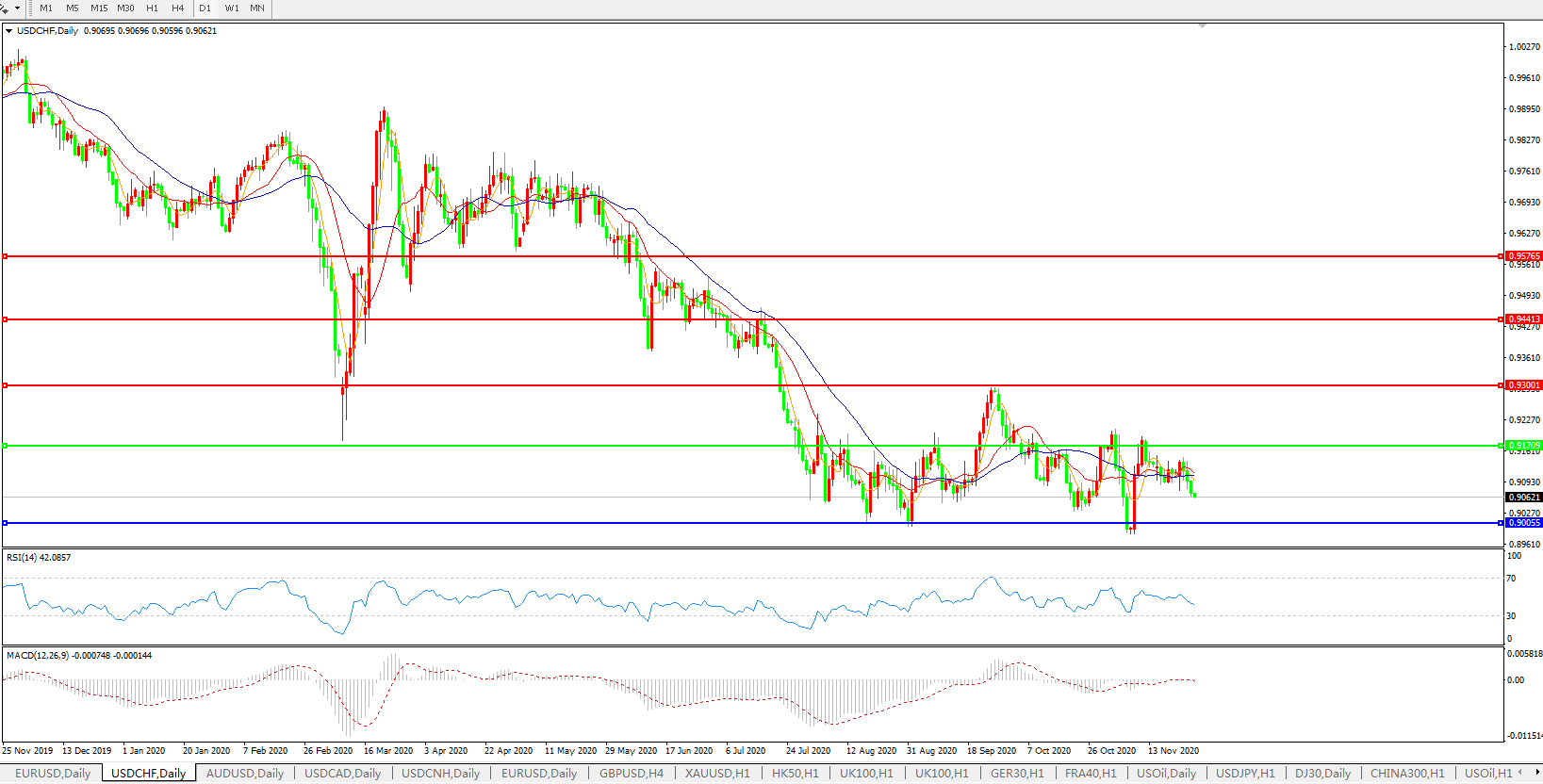 美元兑瑞郎继续走弱,0.91关口成重要压制