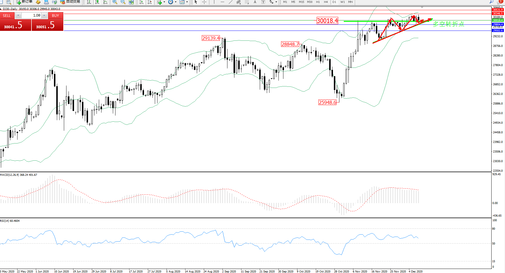 道琼斯指数DJ30—— 日K线图显示:
