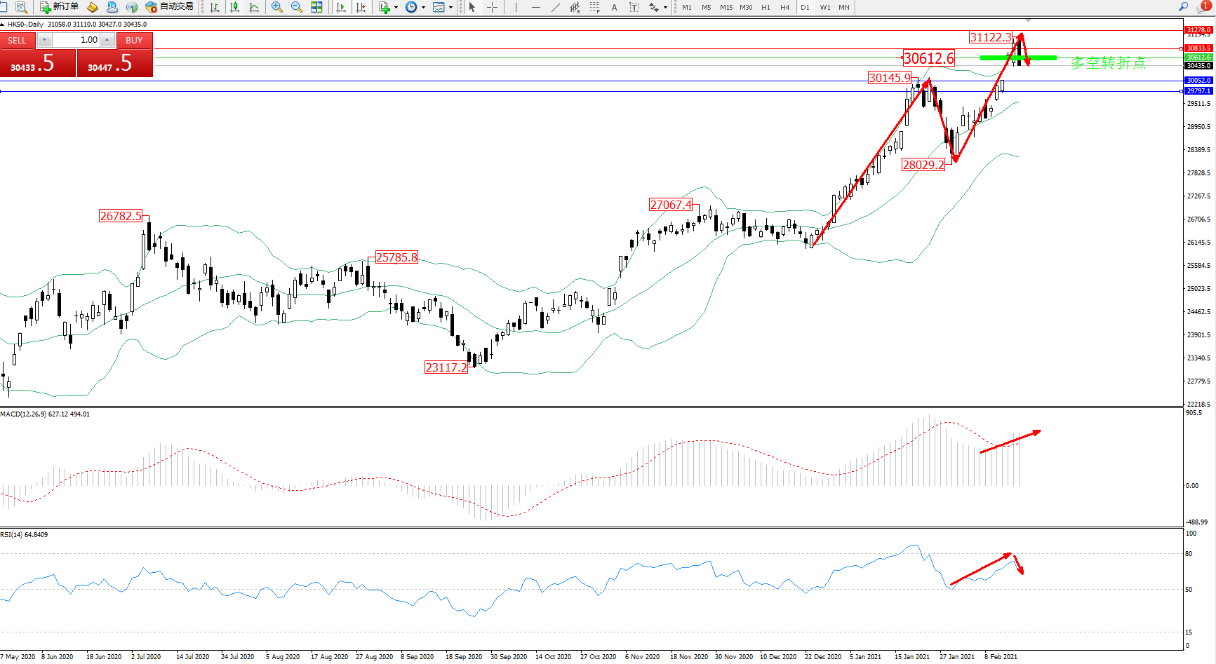 技术点评:多头动力延续布林带指标通道中上轨区间持续震荡上扬态势良好,高位突破上轨附近节点至31122位置后遇阻急速震荡回撤,布林带指标呈收口走势后开始有张口迹象,关注上轨下方附近节点,MACD指标处于堵头区域持续震荡上扬中,RSI指标处于多头区域持续震荡上扬后开始反转下移;