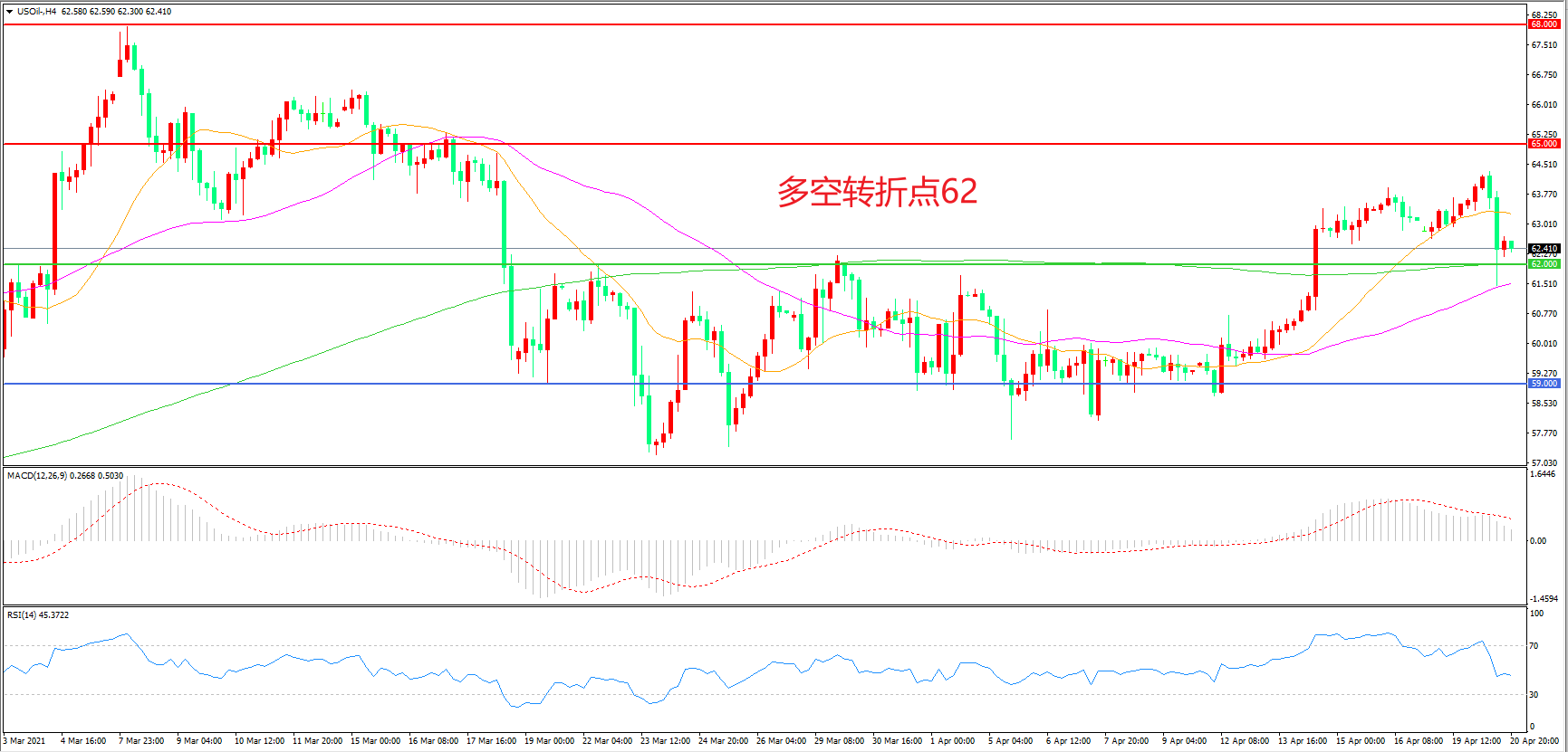 周二(4月20日),印度疫情卷土重来导致市场风险情绪回落,美国WTI原油跌逾2.7%,收报62.44美元/桶。根据印度卫生部公布的最新数据,过去24小时内,印度新增新冠肺炎确诊病例259170例,作为世界第五大经济体的印度,疫情如此失控,将会对油价需求产生明显影响,疫情卷土重来的阴影会在情绪上对市场产生冲击。