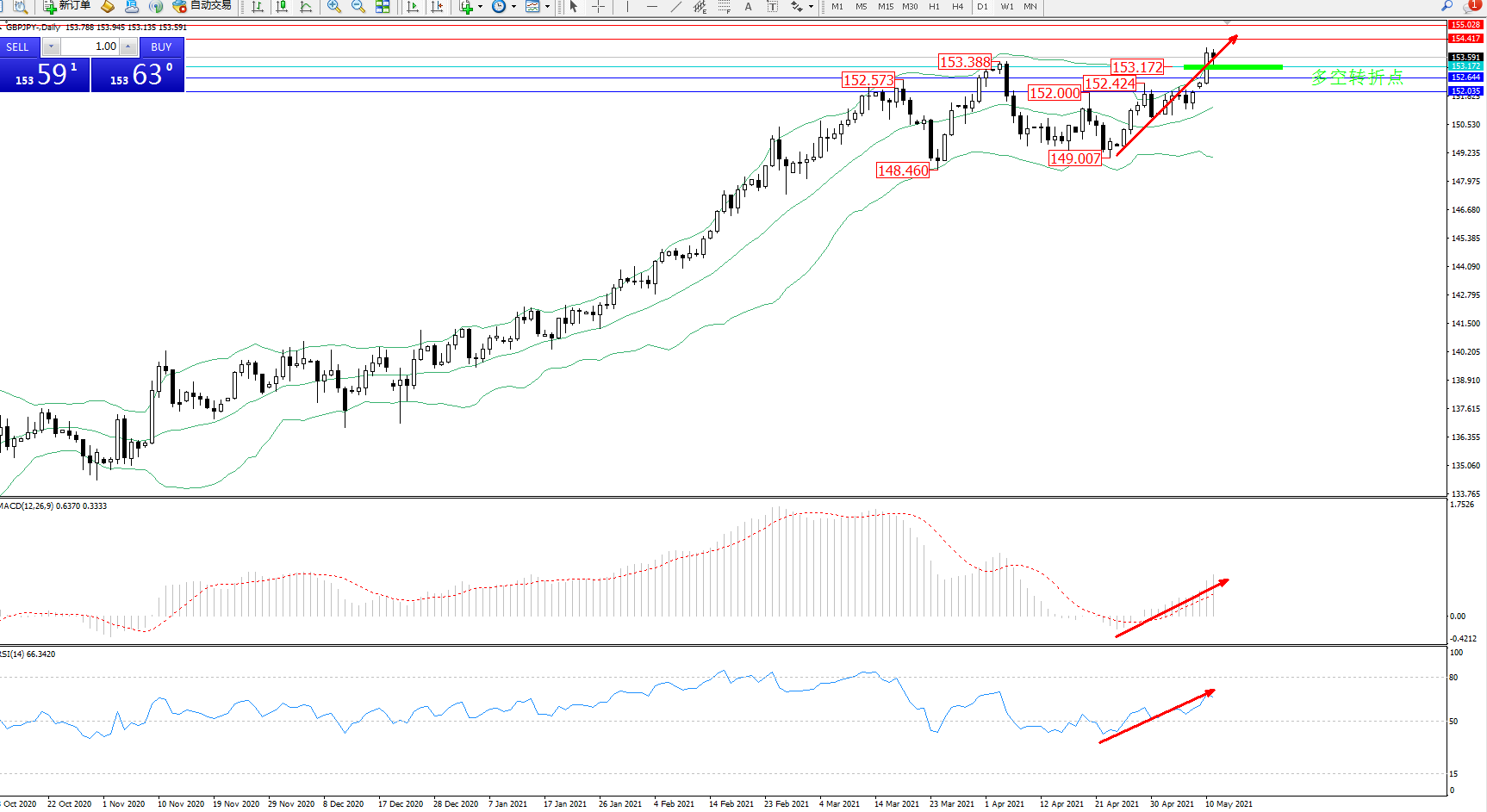 交易策略:153.172上方看涨,目标154.417、155.028